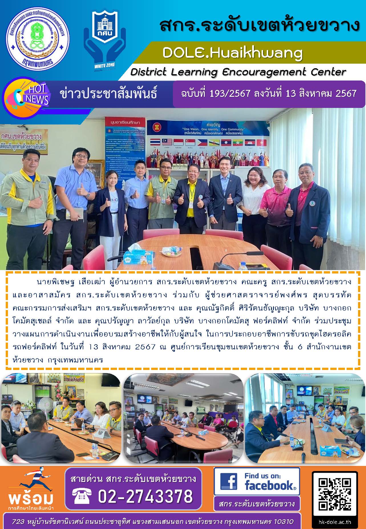 นายพิเชษฐ เสือเฒ่า ผู้อำนวยการ สกร.ระดับเขตห้วยขวาง คณะครู สกร.ระดับเขตห้วยขวาง และอาสาสมัคร สกร.ระดับเขตห้วยขวาง ร่วมกับ ผู้ช่วยศาสตราจารย์พงศ์พร สุดบรรทัด คณะกรรมการส่งเสริมฯ สกร.ระดับเขตห้วยขวาง และ คุณณัฐกิตติ์ ศิริรัตนธัญญะกุล บริษัท บางกอกโคมัตสุเซลล์ จำกัด และ คุณปรัญญา ลาวัลย์กุล บริษัท บางกอกโคมัตสุ ฟอร์คลิฟท์ จำกัด ร่วมประชุมวางแผนการดำเนินงานเพื่ออบรมสร้างอาชีพให้กับผู้สนใจ ในการประกอบอาชีพการขับรถขุดไฮดรอลิค รถฟอร์คลิฟท์ ในวันที่ 13 สิงหาคม 2567 ณ ศูนย์การเรียนชุมขนเขตห้วยขวาง ชั้น 6 สำนักงานเขตห้วยขวาง กรุงเทพมหานคร