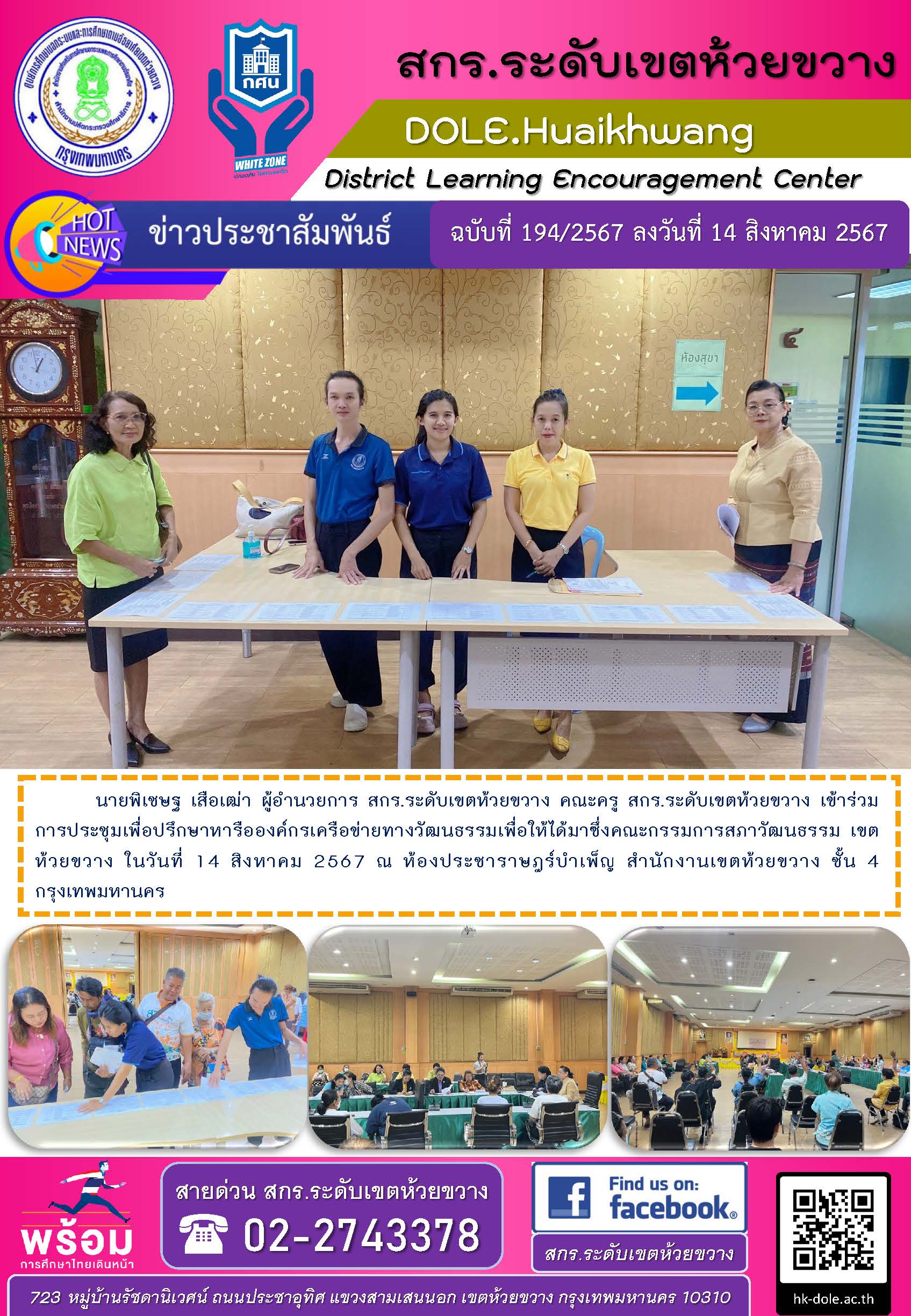 นายพิเชษฐ เสือเฒ่า ผู้อำนวยการ สกร.ระดับเขตห้วยขวาง คณะครู สกร.ระดับเขตห้วยขวาง เข้าร่วมการประชุมเพื่อปรึกษาหารือองค์กรเครือข่ายทางวัฒนธรรมเพื่อให้ได้มาซึ่งคณะกรรมการสภาวัฒนธรรม เขตห้วยขวาง ในวันที่ 14 สิงหาคม 2567 ณ ห้องประชาราษฎร์บำเพ็ญ สำนักงานเขตห้วยขวาง ชั้น 4 กรุงเทพมหานคร