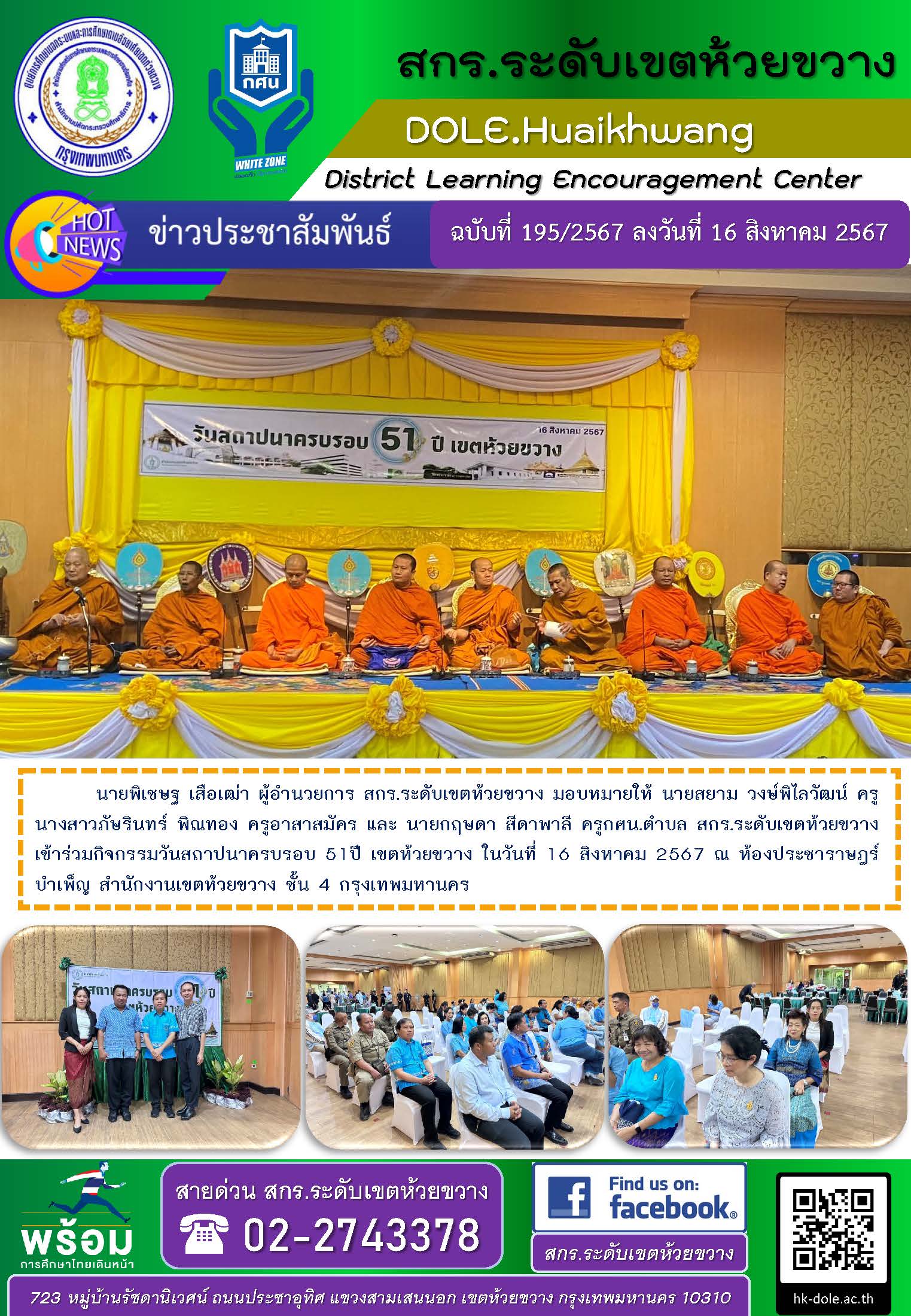 นายพิเชษฐ เสือเฒ่า ผู้อำนวยการ สกร.ระดับเขตห้วยขวาง มอบหมายให้ นายสยาม วงษ์พิไลวัฒน์ ครู นางสาวภัษรินทร์ พิณทอง ครูอาสาสมัคร และ นายกฤษดา สีดาพาลี ครูกศน.ตำบล สกร.ระดับเขตห้วยขวาง เข้าร่วมกิจกรรมวันสถาปนาครบรอบ 51 ปี เขตห้วยขวาง ในวันที่ 16 สิงหาคม 2567 ณ ห้องประชาราษฎร์บำเพ็ญ สำนักงานเขตห้วยขวาง ชั้น 4 กรุงเทพมหานคร