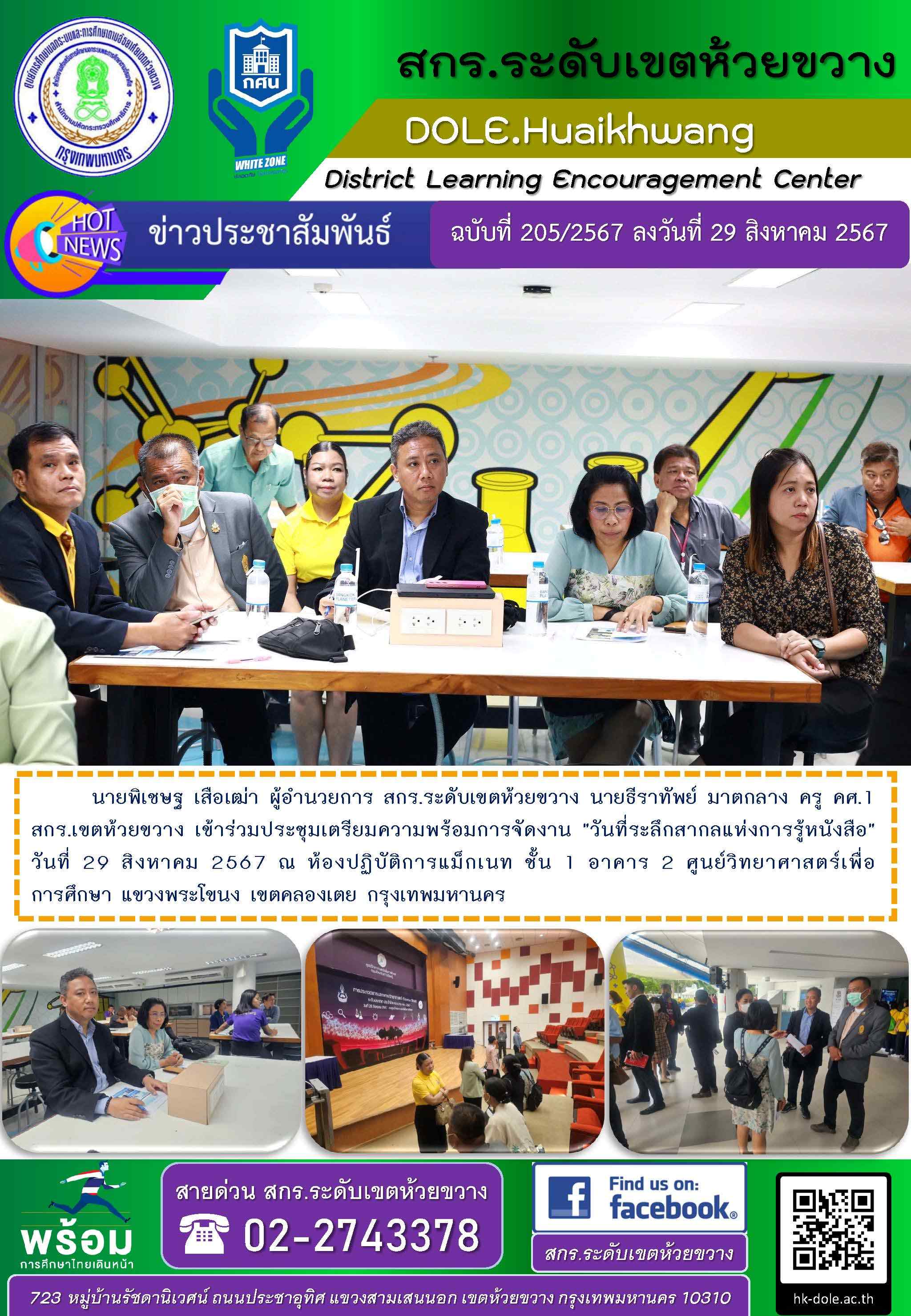 นายพิเชษฐ เสือเฒ่า ผู้อำนวยการ สกร.ระดับเขตห้วยขวาง นายธีราทัพย์ มาตกลาง ครู คศ.1 สกร.เขตห้วยขวาง เข้าร่วมประชุมเตรียมความพร้อมการจัดงาน "วันที่ระลึกสากลแห่งการรู้หนังสือ" วันที่ 29 สิงหาคม 2567 ณ ห้องปฏิบัติการแม็กเนท ชั้น 1 อาคาร 2 ศูนย์วิทยาศาสตร์เพื่อการศึกษา แขวงพระโขนง เขตคลองเตย กรุงเทพมหานคร