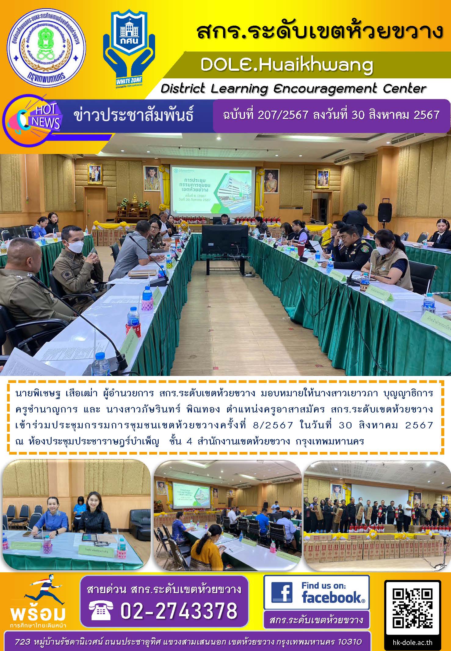 นายพิเชษฐ เสือเฒ่า ผู้อำนวยการ สกร.ระดับเขตห้วยขวาง มอบหมายให้นางสาวเยาวภา บุญญาธิการ ครูชำนาญการ และ นางสาวภัษรินทร์ พิณทอง ตำแหน่งครูอาสาสมัคร สกร.ระดับเขตห้วยขวาง เข้าร่วมประชุมกรรมการชุมชนเขตห้วยขวางครั้งที่ 8/2567 ในวันที่ 30 สิงหาคม 2567 ณ ห้องประชุมประชาราษฎร์บำเพ็ญ ชั้น 4 สำนักงานเขตห้วยขวาง กรุงเทพมหานคร