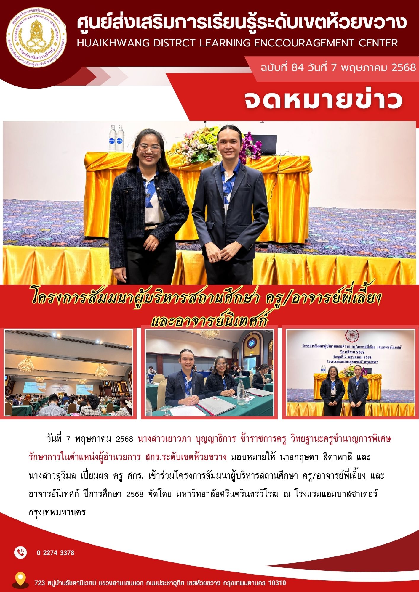 รักษาการในตำแหน่งผู้อำนวยการ สกร.ระดับเขตห้วยขวาง มอบหมายให้ นายกฤษดา สีดาพาลี และนางสาวสุวิมล เปี่ยมผล ครู ศกร. เข้าร่วมโครงการสัมมนาผู้บริหารสถานศึกษา ครู/อาจารย์พี่เลี้ยง และอาจารย์นิเทศก์ ปีการศึกษา 2568 จัดโดย มหาวิทยาลัยศรีนครินทรวิโรฒ ณ โรงแรมแอมบาสซาเดอร์ กรุงเทพมหานคร