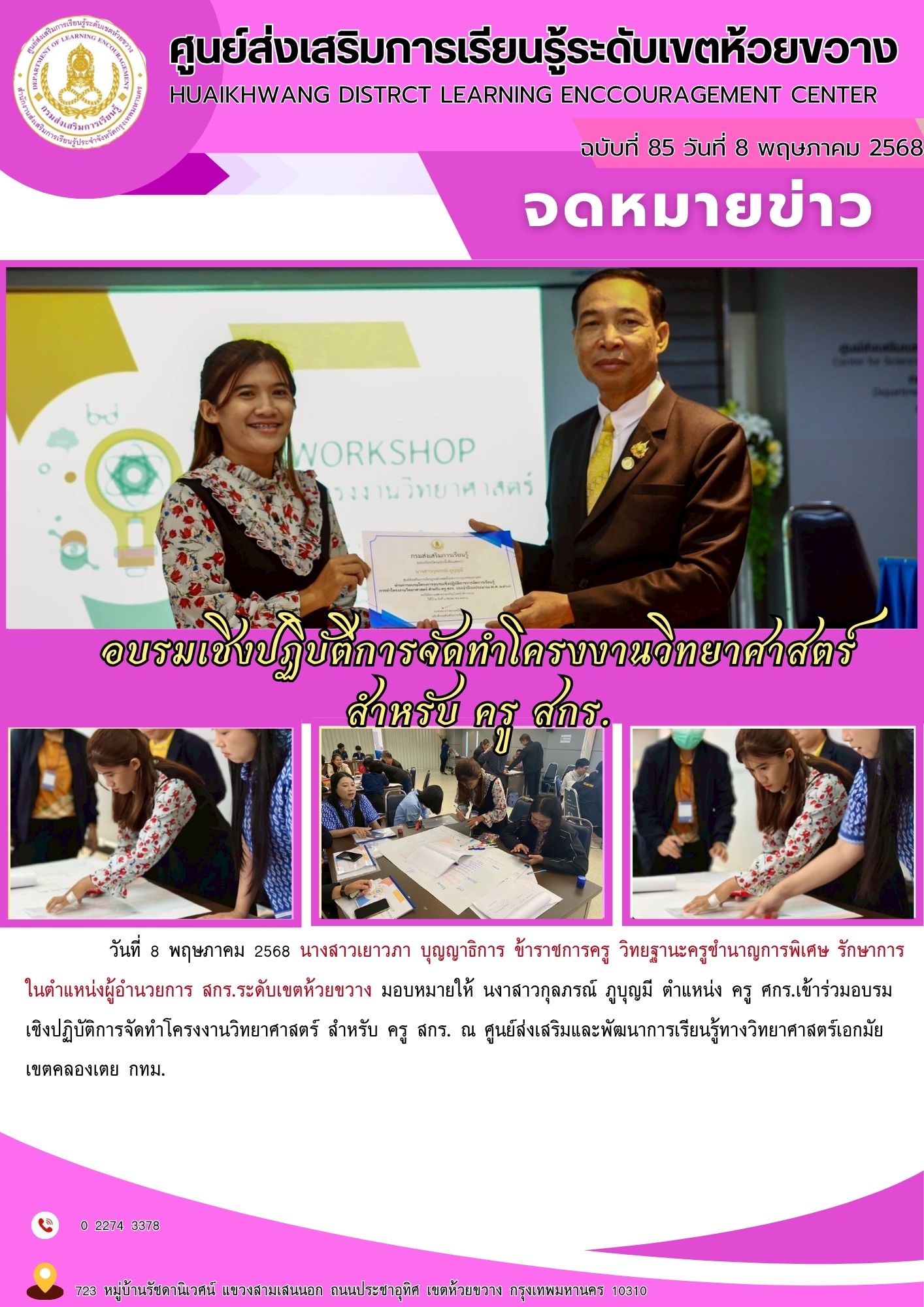 ในตำแหน่งผู้อำนวยการ สกร.ระดับเขตห้วยขวาง มอบหมายให้ นงาสาวกุลภรณ์ ภูบุญมี ตำแหน่ง ครู ศกร.เข้าร่วมอบรมเชิงปฏิบัติการจัดทำโครงงานวิทยาศาสตร์ สำหรับ ครู สกร. ณ ศูนย์ส่งเสริมและพัฒนาการเรียนรู้ทางวิทยาศาสตร์เอกมัย เขตคลองเตย กทม.