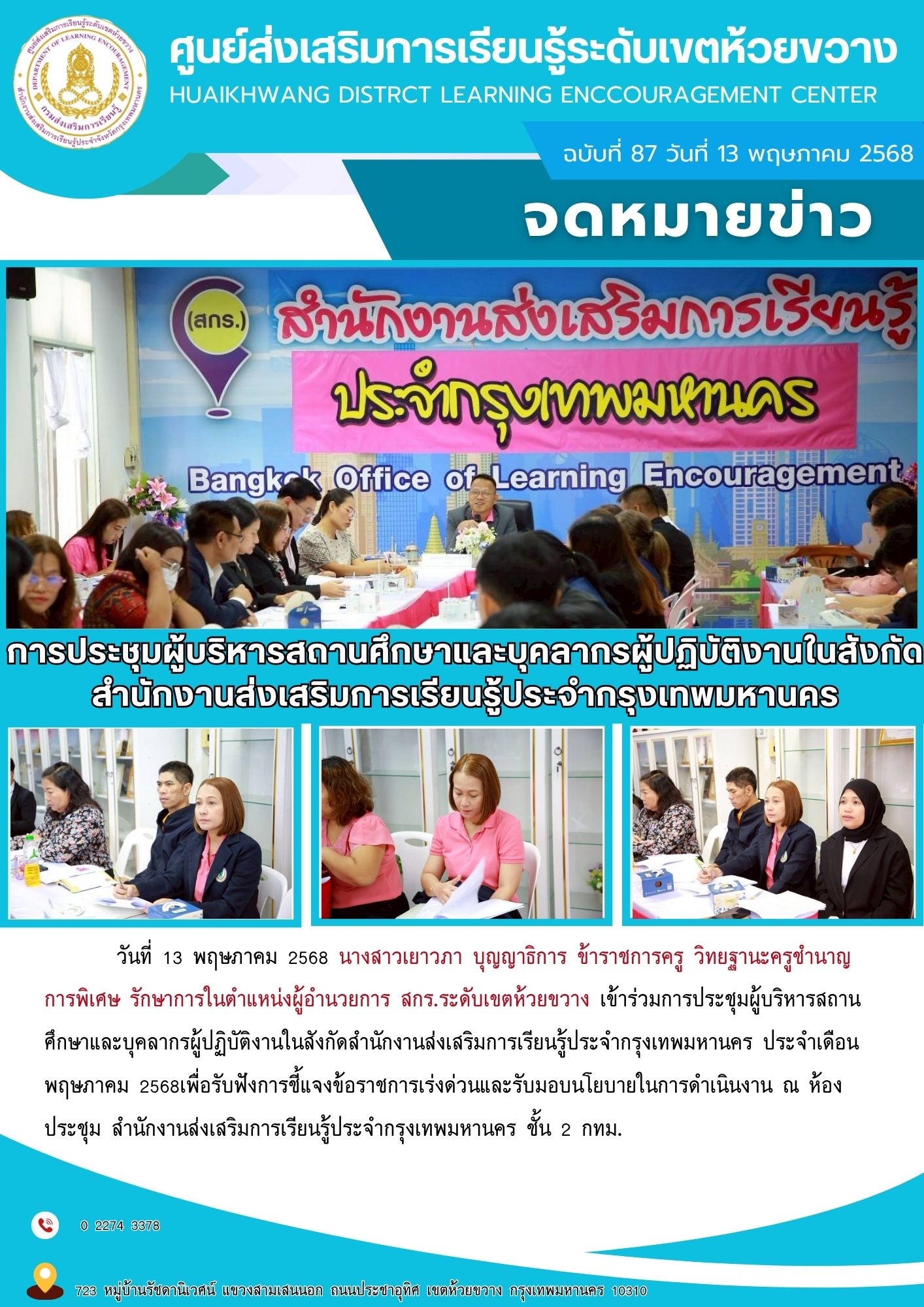 เข้าร่วมการประชุมผู้บริหารสถานศึกษาและบุคลากรผู้ปฏิบัติงานในสังกัดสำนักงานส่งเสริมการเรียนรู้ประจำกรุงเทพมหานคร ประจำเดือน พฤษภาคม 2568เพื่อรับฟังการชี้แจงข้อราชการเร่งด่วนและรับมอบนโยบายในการดำเนินงาน ณ ห้องประชุม สำนักงานส่งเสริมการเรียนรู้ประจำกรุงเทพมหานคร ชั้น 2 กทม.