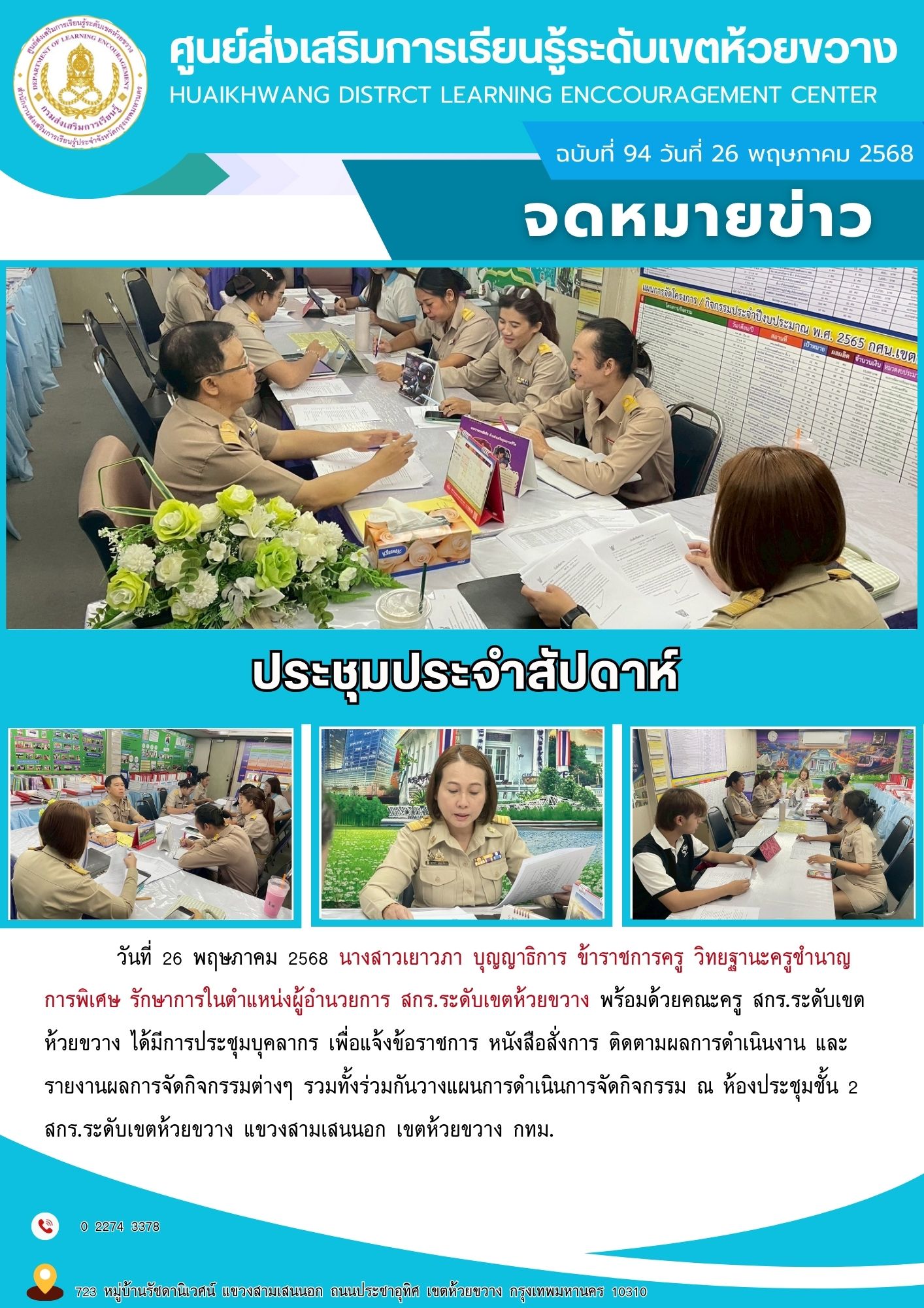 วันที่ 26 พฤษภาคม 2568 นางสาวเยาวภา บุญญาธิการ ข้าราชการครู วิทยฐานะครูชำนาญการพิเศษ รักษาการในตำแหน่งผู้อำนวยการ สกร.ระดับเขตห้วยขวาง พร้อมด้วยคณะครู สกร.ระดับเขตห้วยขวาง ได้มีการประชุมบุคลากร เพื่อแจ้งข้อราชการ หนังสือสั่งการ ติดตามผลการดำเนินงาน และรายงานผลการจัดกิจกรรมต่างๆ รวมทั้งร่วมกันวางแผนการดำเนินการจัดกิจกรรม ณ ห้องประชุมชั้น 2 สกร.ระดับเขตห้วยขวาง แขวงสามเสนนอก เขตห้วยขวาง กทม.