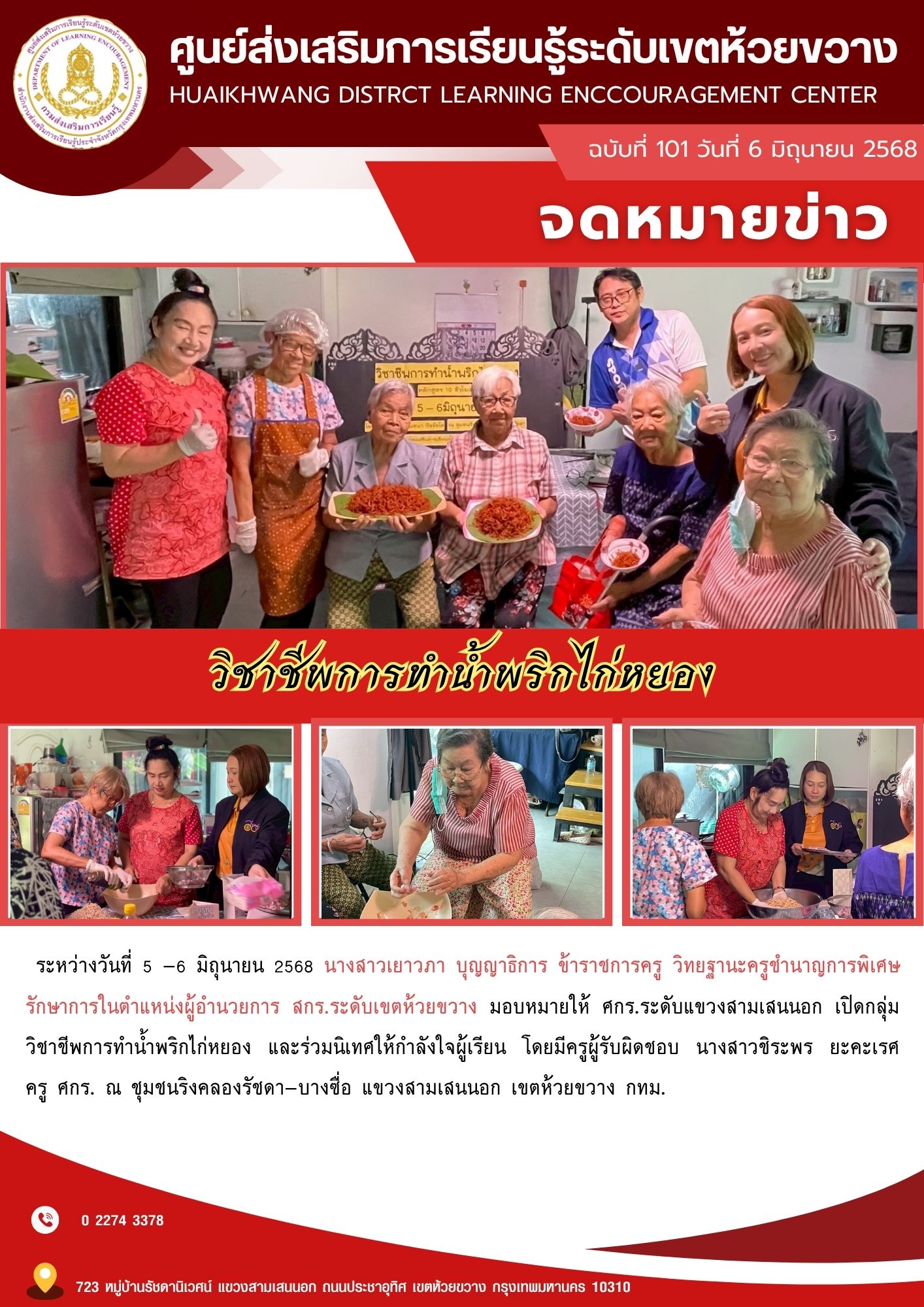มอบหมายให้ ศกร.ระดับแขวงสามเสนนอก เปิดกลุ่มวิชาชีพการทำน้ำพริกไก่หยอง และร่วมนิเทศให้กำลังใจผู้เรียน โดยมีครูผู้รับผิดชอบ นางสาวชิระพร ยะคะเรศ ครู ศกร. ณ ชุมชนริงคลองรัชดา-บางซื่อ แขวงสามเสนนอก เขตห้วยขวาง กทม.