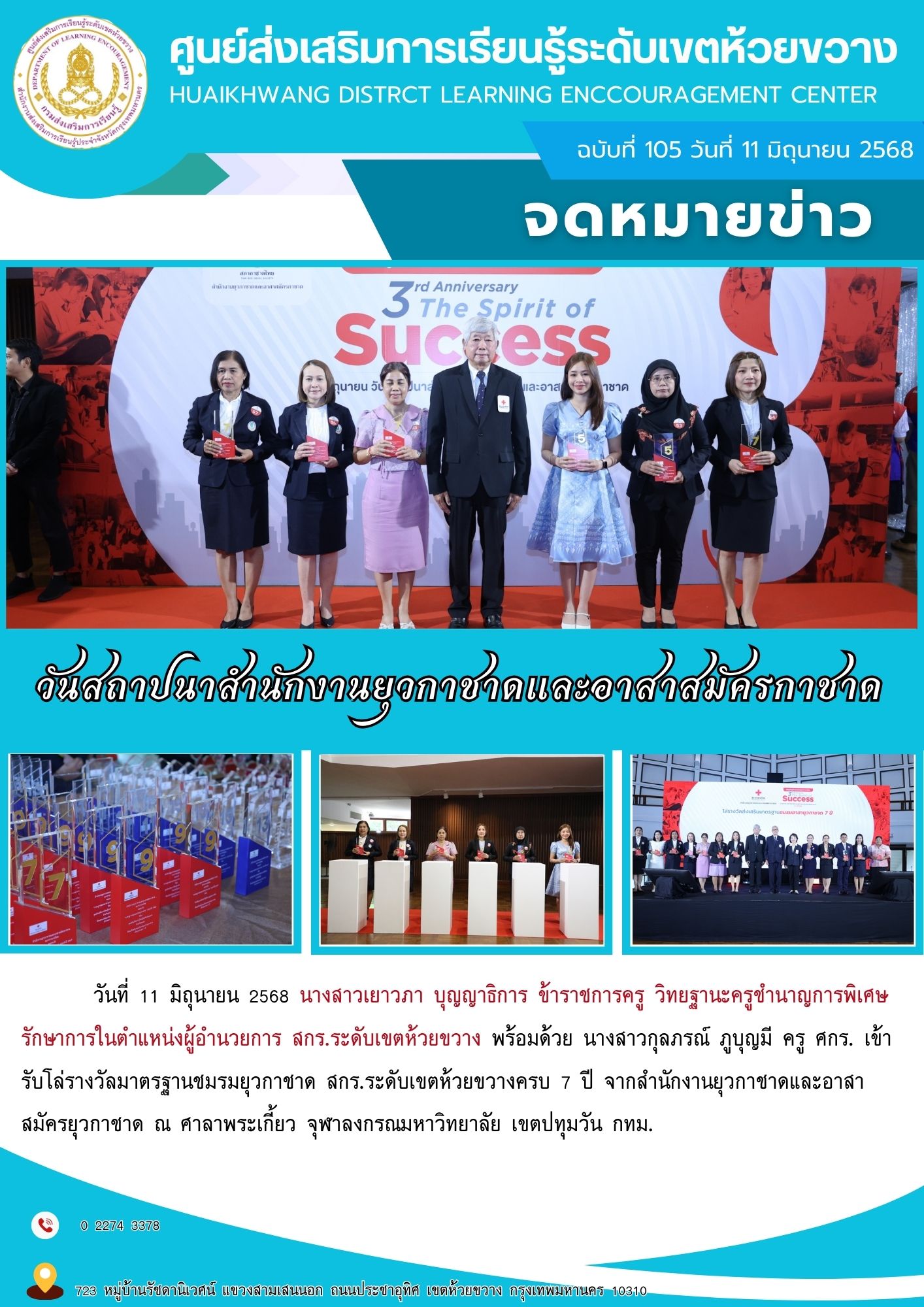 วันที่ 11 มิถุนายน 2568 นางสาวเยาวภา บุญญาธิการ ข้าราชการครู วิทยฐานะครูชำนาญการพิเศษ รักษาการในตำแหน่งผู้อำนวยการ สกร.ระดับเขตห้วยขวาง พร้อมด้วย นางสาวกุลภรณ์ ภูบุญมี ครู ศกร. เข้ารับโล่รางวัลมาตรฐานชมรมยุวกาชาด สกร.ระดับเขตห้วยขวางครบ 7 ปี จากสำนักงานยุวกาชาดและอาสาสมัครยุวกาชาด ณ ศาลาพระเกี้ยว จุฬาลงกรณมหาวิทยาลัย เขตปทุมวัน กทม.