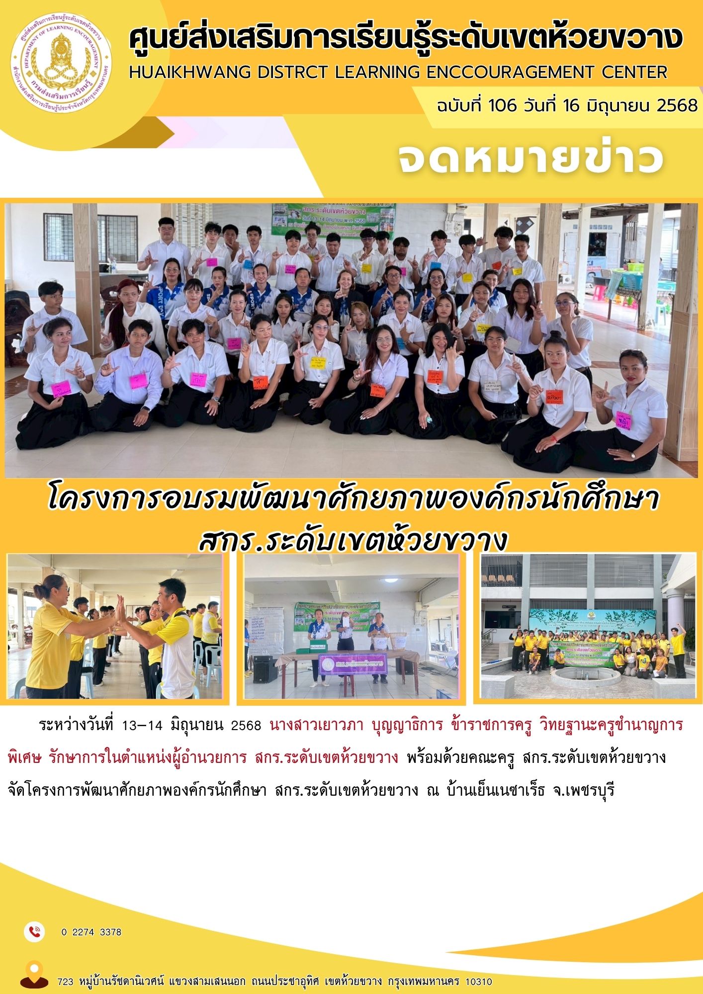 ระหว่างวันที่ 13-14 มิถุนายน 2568 นางสาวเยาวภา บุญญาธิการ ข้าราชการครู วิทยฐานะครูชำนาญการพิเศษ รักษาการในตำแหน่งผู้อำนวยการ สกร.ระดับเขตห้วยขวาง พร้อมด้วยคณะครู สกร.ระดับเขตห้วยขวาง จัดโครงการพัฒนาศักยภาพองค์กรนักศึกษา สกร.ระดับเขตห้วยขวาง ณ บ้านเย็นเนซาเร็ธ จ.เพชรบุรี
