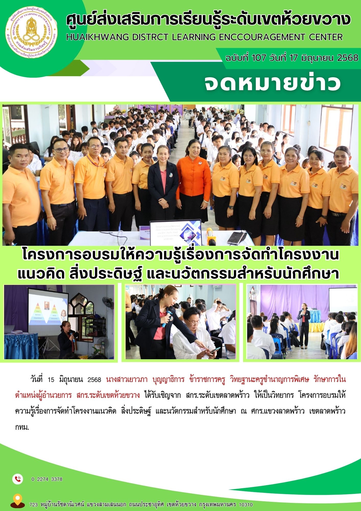 ได้รับเชิญจาก สกร.ระดับเขตลาดพร้าว ให้เป็นวิทยากร โครงการอบรมให้ความรู้เรื่องการจัดทำโครงงานแนวคิด สิ่งประดิษฐ์ และนวัตกรรมสำหรับนักศึกษา ณ ศกร.แขวงลาดพร้าว เขตลาดพร้าว กทม.