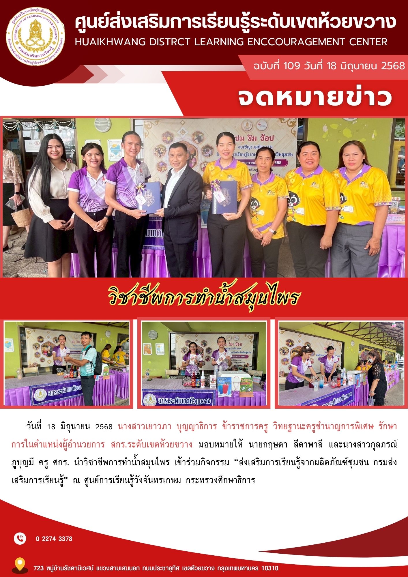 มอบหมายให้ นายกฤษดา สีดาพาลี และนางสาวกุลภรณ์ ภูบุญมี ครู ศกร. นำวิชาชีพการทำน้ำสมุนไพร เข้าร่วมกิจกรรม “ส่งเสริมการเรียนรู้จากผลิตภัณฑ์ชุมชน กรมส่งเสริมการเรียนรู้” ณ ศูนย์การเรียนรู้วังจันทรเกษม กระทรวงศึกษาธิการ