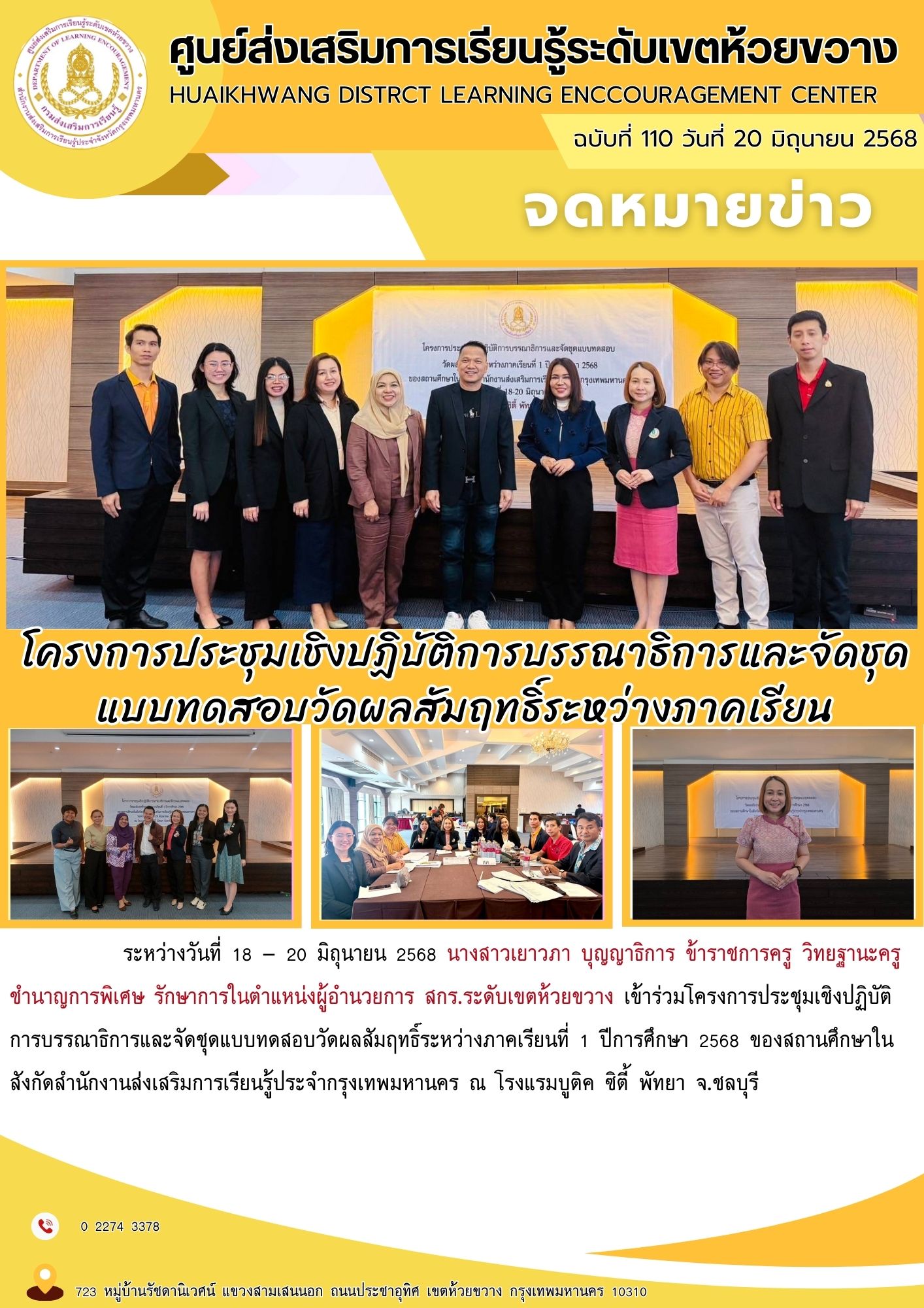 ระหว่างวันที่ 18 - 20 มิถุนายน 2568 นางสาวเยาวภา บุญญาธิการ ข้าราชการครู วิทยฐานะครูชำนาญการพิเศษ รักษาการในตำแหน่งผู้อำนวยการ สกร.ระดับเขตห้วยขวาง เข้าร่วมโครงการประชุมเชิงปฏิบัติการบรรณาธิการและจัดชุดแบบทดสอบวัดผลสัมฤทธิ์ระหว่างภาคเรียนที่ 1 ปีการศึกษา 2568 ของสถานศึกษาในสังกัดสำนักงานส่งเสริมการเรียนรู้ประจำกรุงเทพมหานคร ณ โรงแรมบูติค ซิตี้ พัทยา จ.ชลบุรี
