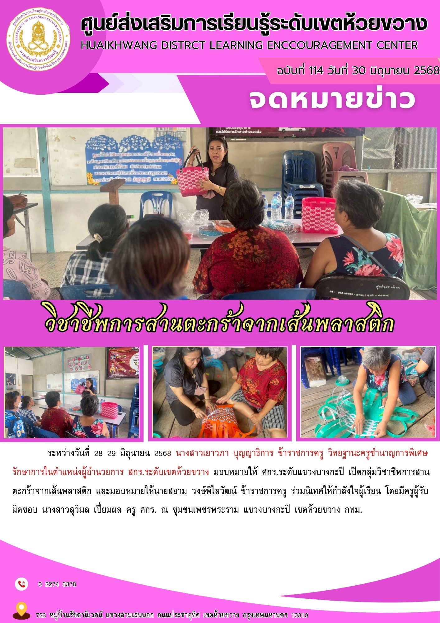 มอบหมายให้ ศกร.ระดับแขวงบางกะปิ เปิดกลุ่มวิชาชีพการสานตะกร้าจากเส้นพลาสติก และมอบหมายให้นายสยาม วงษ์พิไลวัฒน์ ข้าราชการครู ร่วมนิเทศให้กำลังใจผู้เรียน โดยมีครูผู้รับผิดชอบ นางสาวสุวิมล เปี่ยมผล ครู ศกร. ณ ชุมชนเพชรพระราม แขวงบางกะปิ เขตห้วยขวาง กทม.