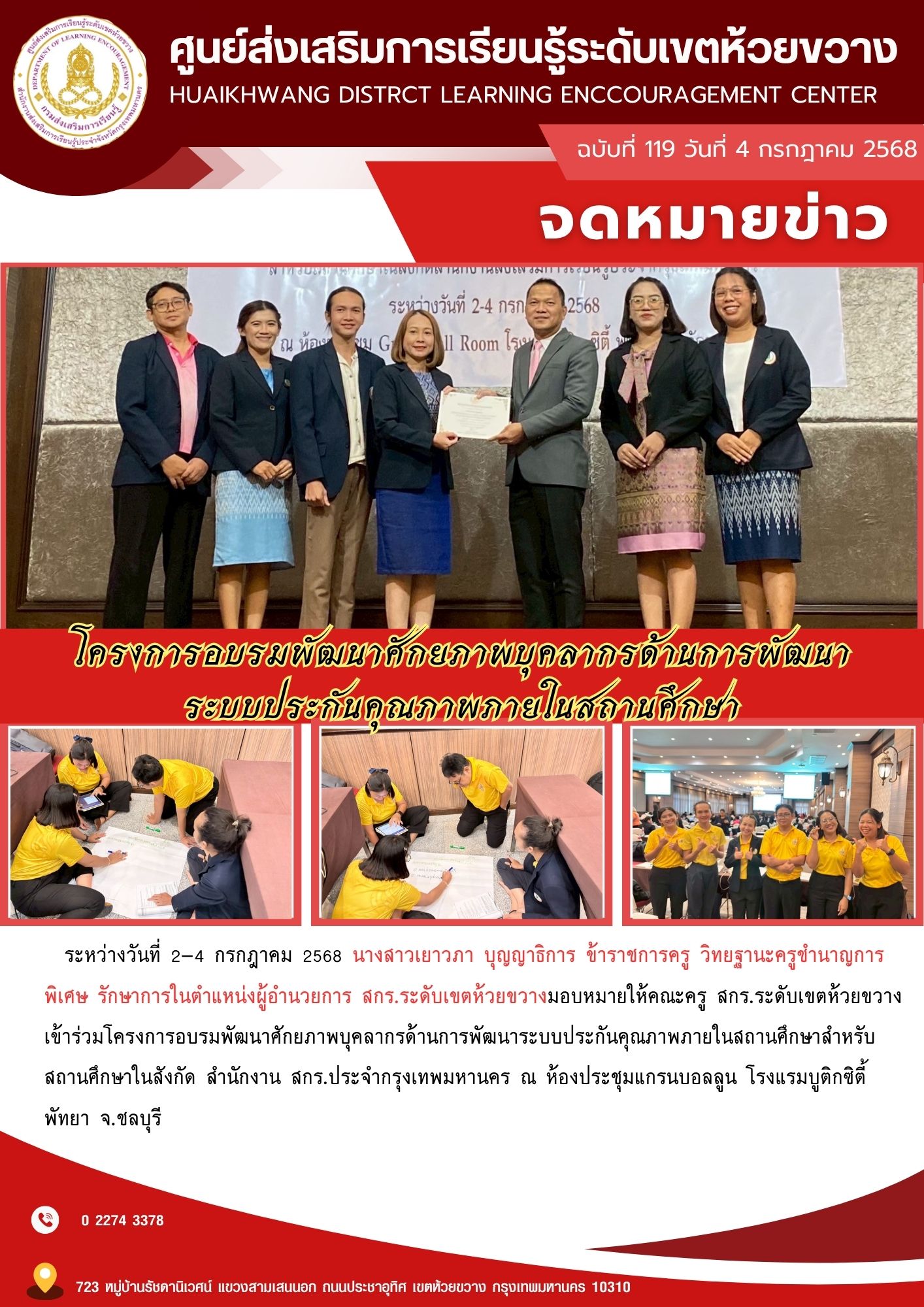 มอบหมายให้คณะครู สกร.ระดับเขตห้วยขวาง เข้าร่วมโครงการอบรมพัฒนาศักยภาพบุคลากรด้านการพัฒนาระบบประกันคุณภาพภายในสถานศึกษาสำหรับสถานศึกษาในสังกัด สำนักงาน สกร.ประจำกรุงเทพมหานคร ณ ห้องประชุมแกรนบอลลูน โรงแรมบูติกซิตี้ พัทยา จ.ชลบุรี
