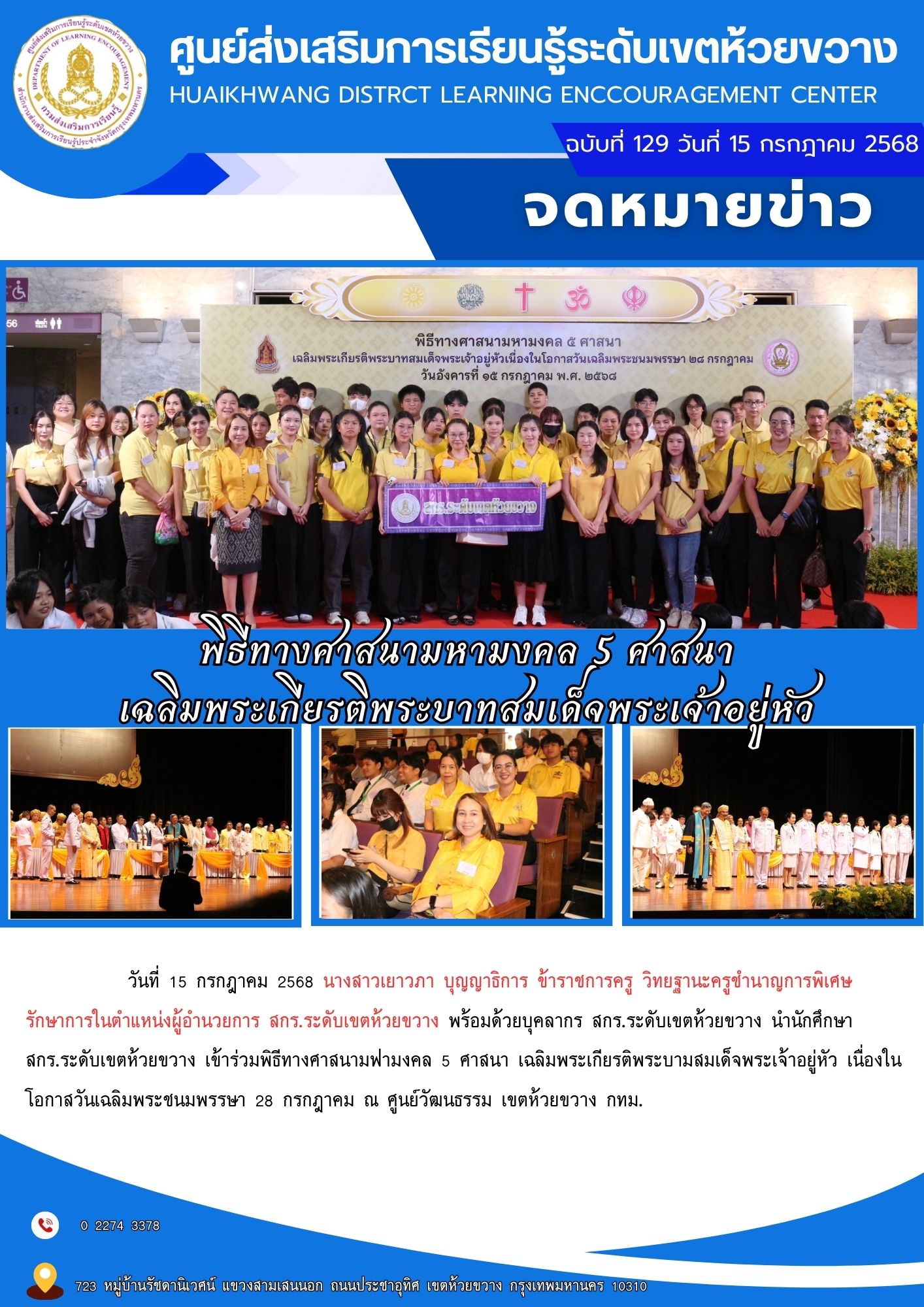 รักษาการในตำแหน่งผู้อำนวยการ สกร.ระดับเขตห้วยขวาง พร้อมด้วยบุคลากร สกร.ระดับเขตห้วยขวาง นำนักศึกษา สกร.ระดับเขตห้วยขวาง เข้าร่วมพิธีทางศาสนามฟามงคล 5 ศาสนา เฉลิมพระเกียรติพระบามสมเด็จพระเจ้าอยู่หัว เนื่องใน