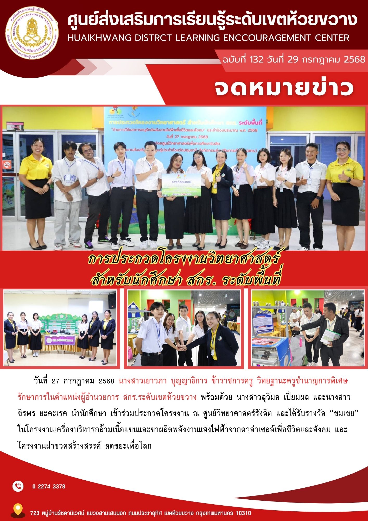 วันที่ 27 กรกฎาคม 2568 นางสาวเยาวภา บุญญาธิการ ข้าราชการครู วิทยฐานะครูชำนาญการพิเศษ รักษาการในตำแหน่งผู้อำนวยการ สกร.ระดับเขตห้วยขวาง พร้อมด้วย นางสาวสุวิมล เปี่ยมผล และนางสาว ชิรพร ยะคะเรศ นำนักศึกษา เข้าร่วมประกวดโครงงาน ณ ศูนย์วิทยาศาสตร์รังสิต และได้รับรางวัล “ชมเชย”