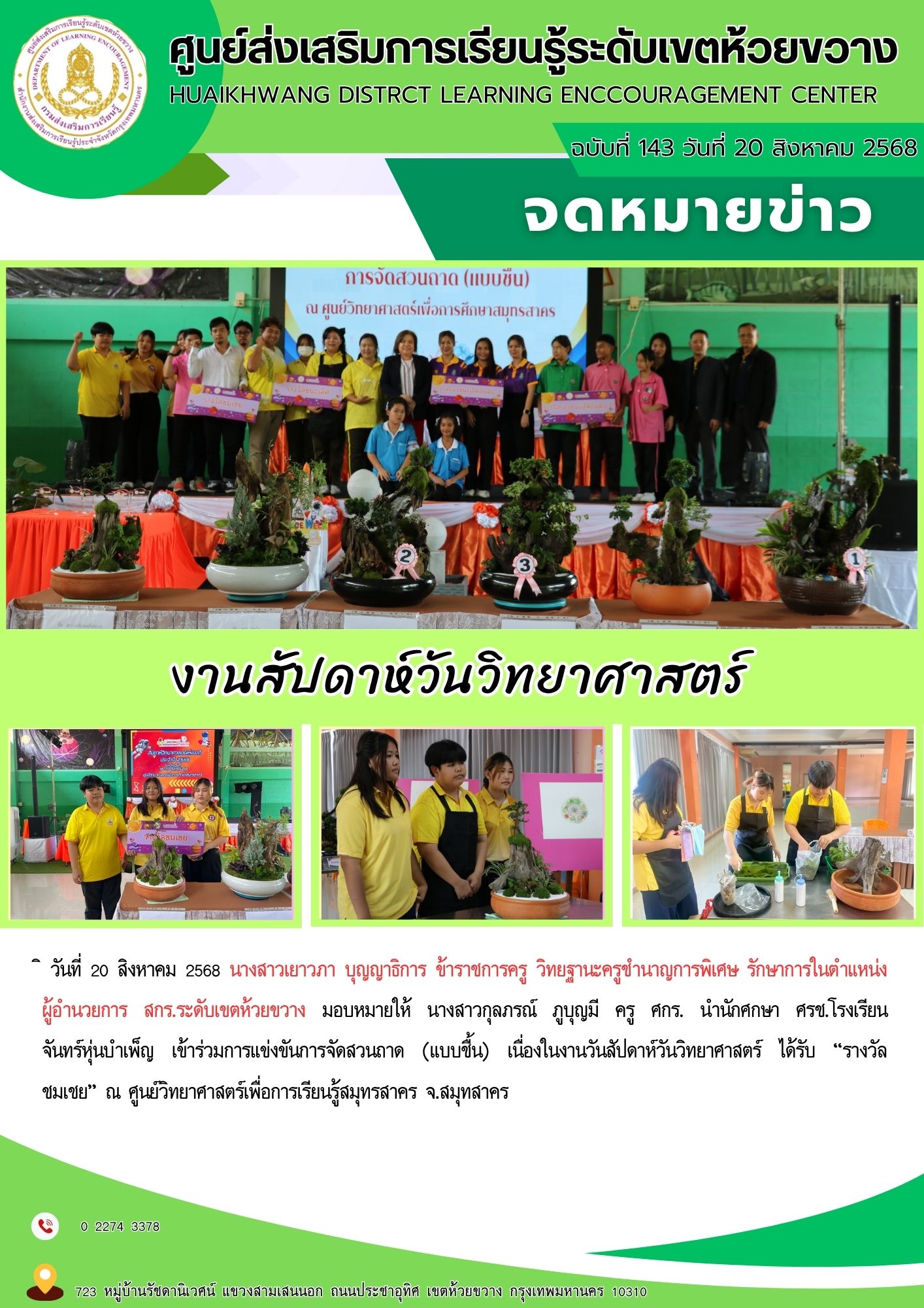 มอบหมายให้ นางสาวกุลภรณ์ ภูบุญมี ครู ศกร. นำนักศกษา ศรช.โรงเรียนจันทร์หุ่นบำเพ็ญ เข้าร่วมการแข่งขันการจัดสวนถาด (แบบชื้น) เนื่องในงานวันสัปดาห์วันวิทยาศาสตร์ ได้รับ “รางวัลชมเชย” ณ ศูนย์วิทยาศาสตร์เพื่อการเรียนรู้สมุทรสาคร จ.สมุทสาคร
